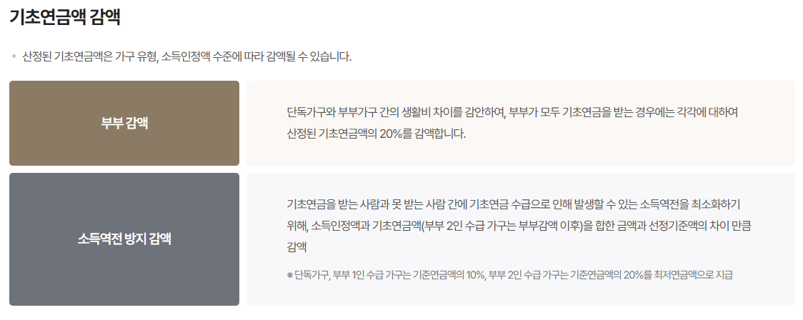 감액 기준 | 국민연금 수령액 월 51만 5,260원 초과 시 50% 감액 감액 후 최소 연금액은 기초연금의 50%로 유지 해외 체류 60일 초과 시 지급 정지 |