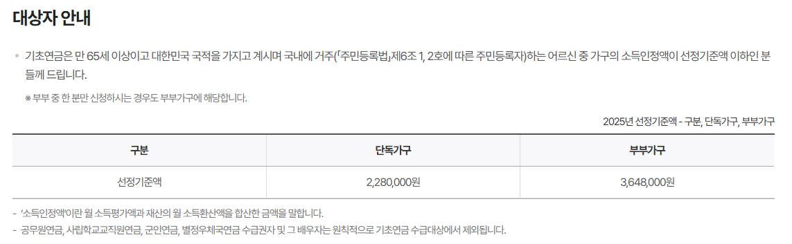 단독가구의 경우 월 소득인정액이 228만 원 이하면 기초연금을 수급할 수 있게 되었습니다. 이는 2024년 기준인 213만 원에서 15만 원이 인상된 금액으로, 더 많은 어르신들이 혜택을 받을 수 있는 기회가 생겼습니다.