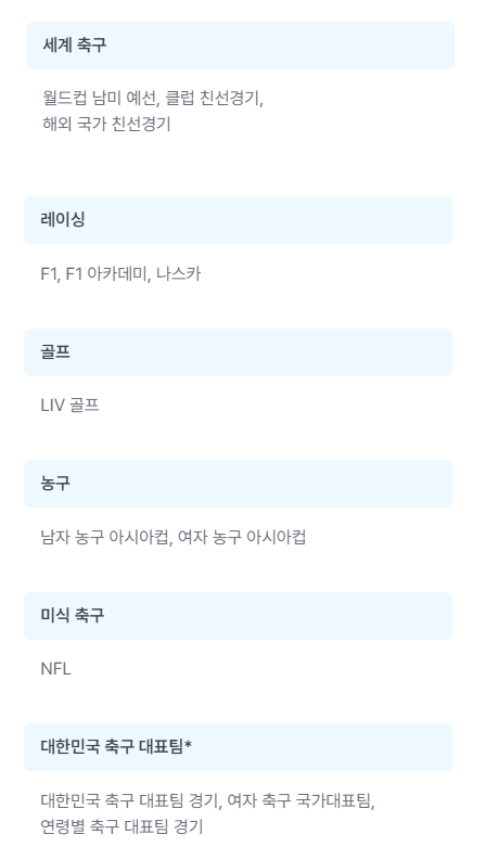 축구 외 종목으로는 북미 4대 스포츠 리그인 NBA, NFL을 비롯해 F1 자동차 경주, 나스카, LIV 골프 투어, 농구 아시아컵 등 폭넓은 스포츠 카테고리를 다루고 있습니다.