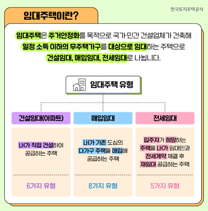 | 임대주택의 3가지 유형 | 건설임대(LH 직접 건설), 매입임대(기존 주택 매입), 전세임대(전세계약 후 재임대) |