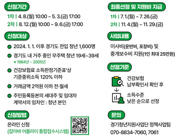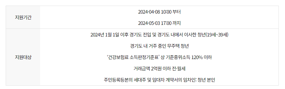 · 지원 대상자: 2024년 1월 1일 이후 경기도 전입 및 경기도 내에서 이사한 만 19세부터 39세까지의 무주택 청년