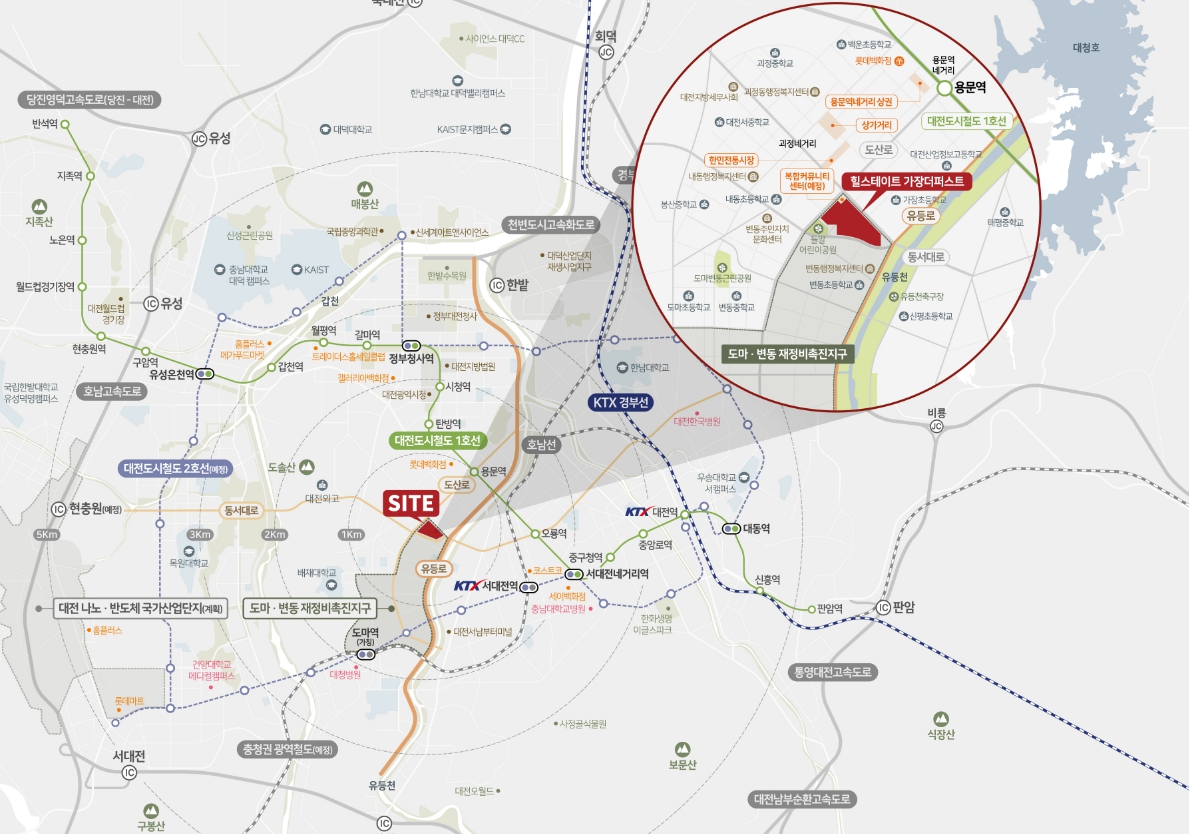 상권으로는 하나로마트 대전서부농협 변동점, 용문점, 내동점이 인근에 있으며, 롯데백화점 대전점도 1.3km 거리에 위치해 있습니다. 473m 거리에는 예정 공원도 조성될 예정입니다.
