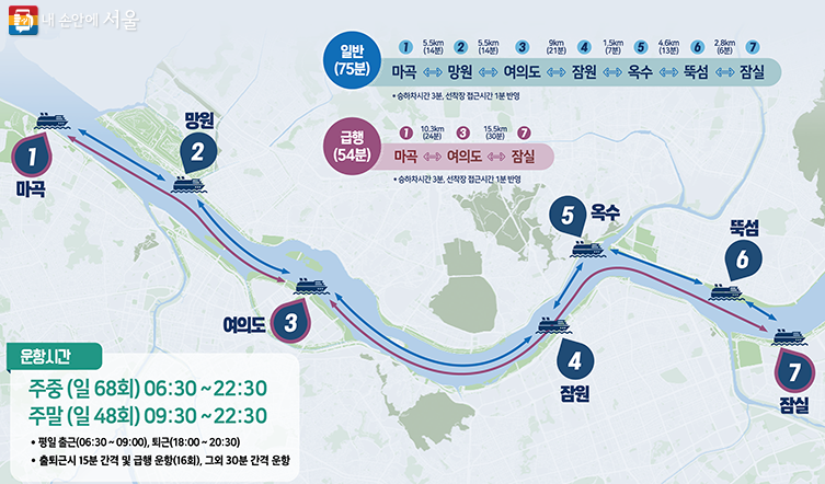 마곡, 여의도, 잠실 세 곳의 선착장만 정차하는 급행 노선도 출퇴근 시간대에 하루 16회 운영됩니다. 급행 노선을 이용하면 마곡~잠실 구간을 기존 75분에서 21분 단축한 54분 만에 주파할 수 있습니다.