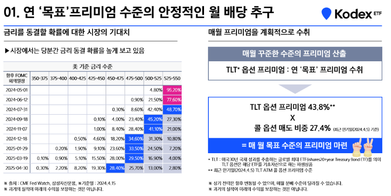 시장 상황에 맞게 옵션 매도 비중을 탄력적으로 조절하고, 만기가 짧은 주간 옵션을 적극 활용해 콜옵션 프리미엄을 극대화하는 전략이 특징적입니다. 이를 통해 금리 인하기에 채권 가격 상승에 따른 자본이득과 커버드콜 프리미엄이라는 인컴 수익을 함께 추구하게 됩니다.